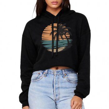 Retro Tropical Sunset Women’s Cropped Hoodie – Summer Palm Hooded Sweatshirt – Trendy Aesthetic Super Crop Top Hoodies